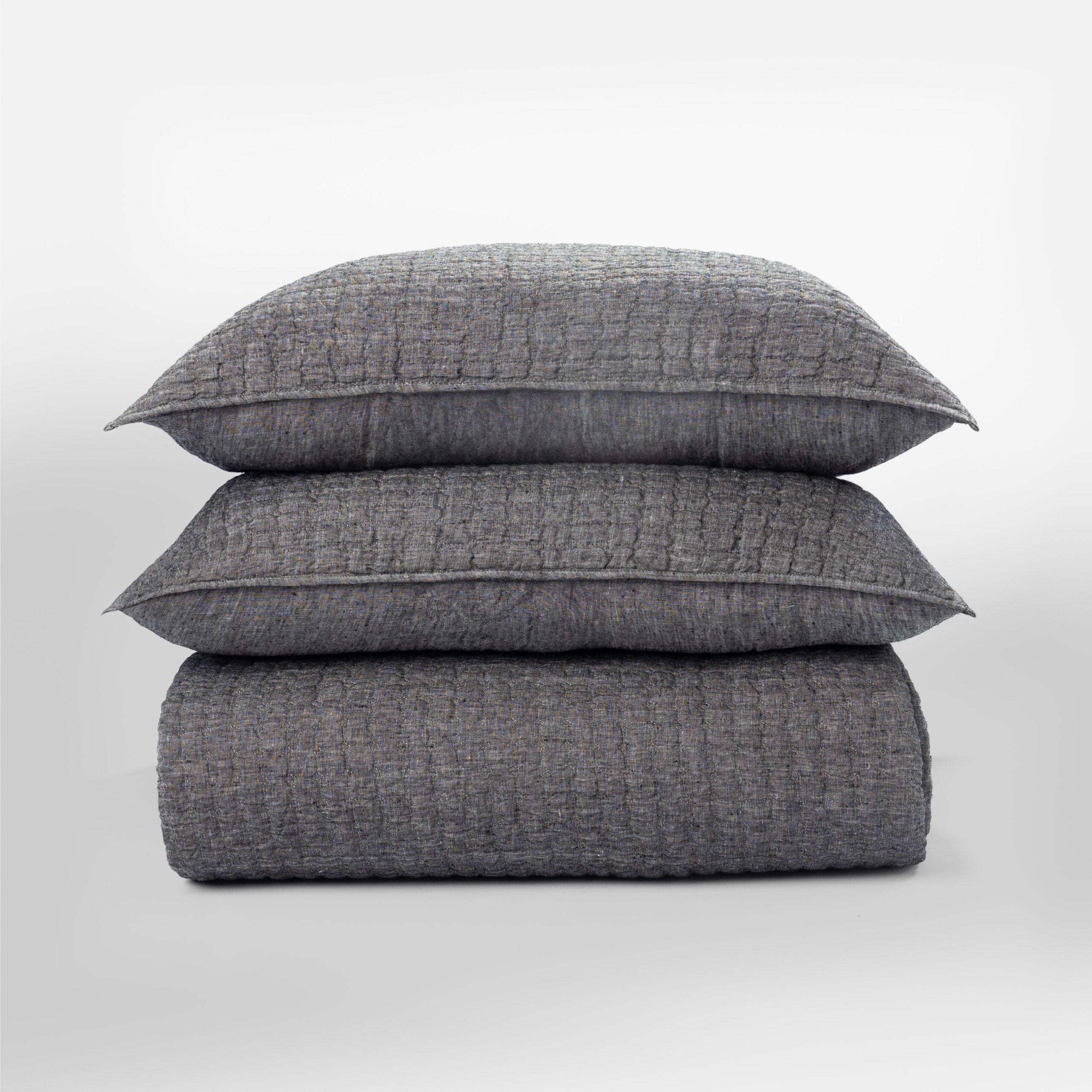 Description: The structured quilting style of Catalina takes on a graphic edge in Asphalt. Paired in stark contrast to Tipton in White, with it’s raw edged flange give this setting an industrial chic effect. Adding Morse Coverlet and XL Bolster in natural adds a graphic note to the pair.
