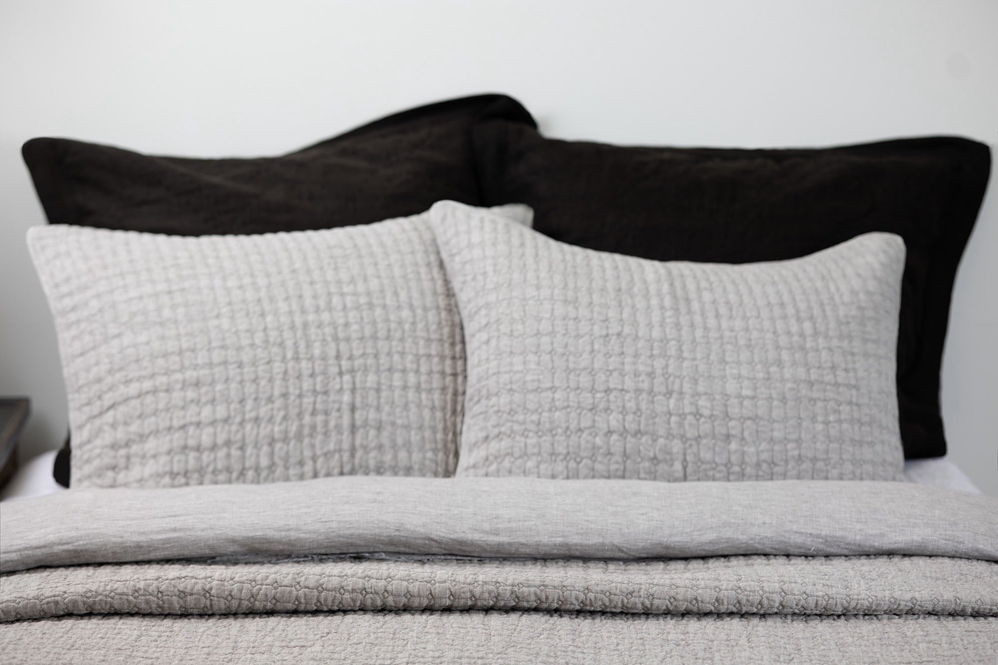 Description: The structured quilting style of Catalina takes on a graphic edge in Asphalt. Paired in stark contrast to Tipton in White, with it’s raw edged flange give this setting an industrial chic effect. Adding Morse Coverlet and XL Bolster in natural adds a graphic note to the pair.