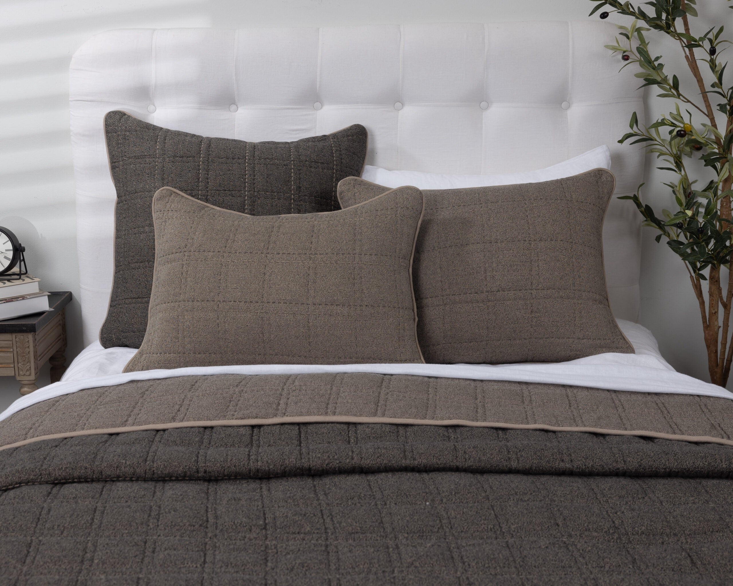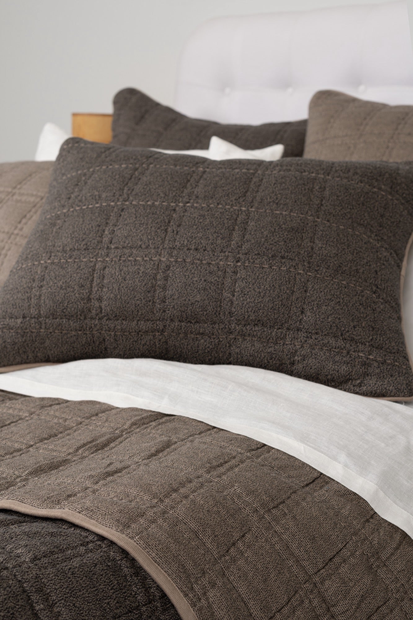 Description: The knit blazer of bedding, the Fletcher collection offers the comfort of sweats with the style of a more structured quilt. A double block style quilting has a subtle contrast and gives this collection a casual yet slightly modern feel. Each colorway is reversible and bound with a taupe contrast binding.