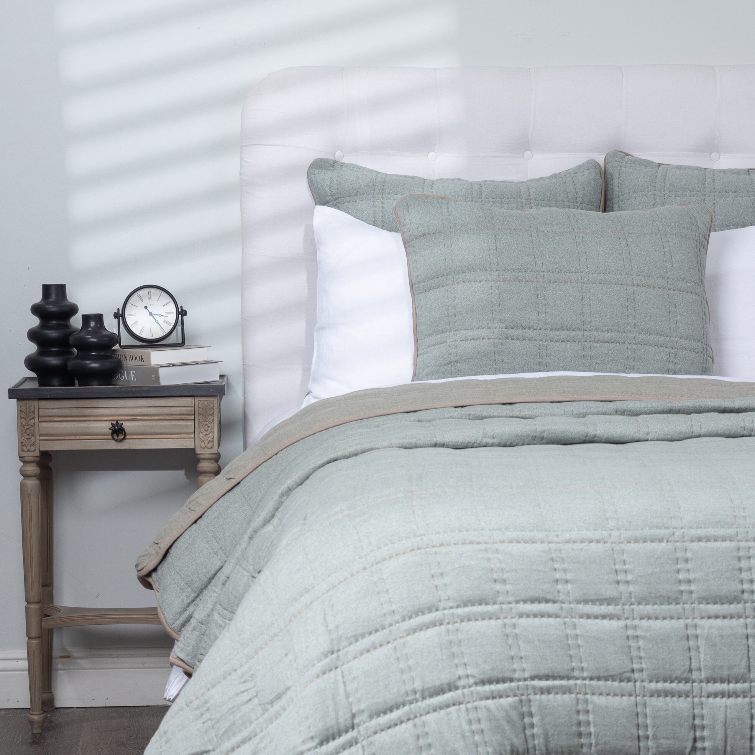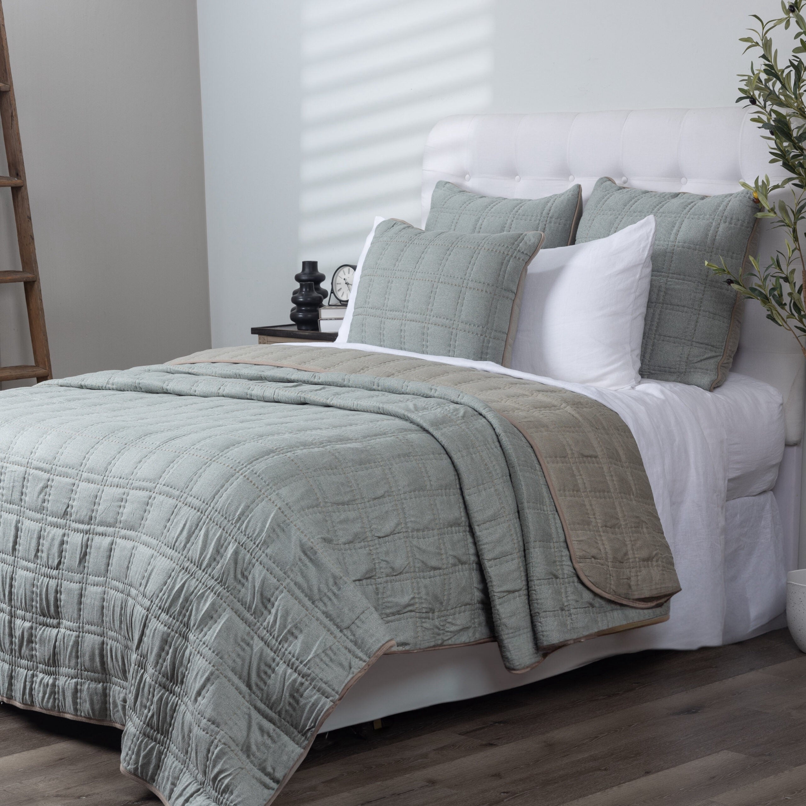 Description: The knit blazer of bedding, the Fletcher collection offers the comfort of sweats with the style of a more structured quilt. A double block style quilting has a subtle contrast and gives this collection a casual yet slightly modern feel. Each colorway is reversible and bound with a taupe contrast binding.