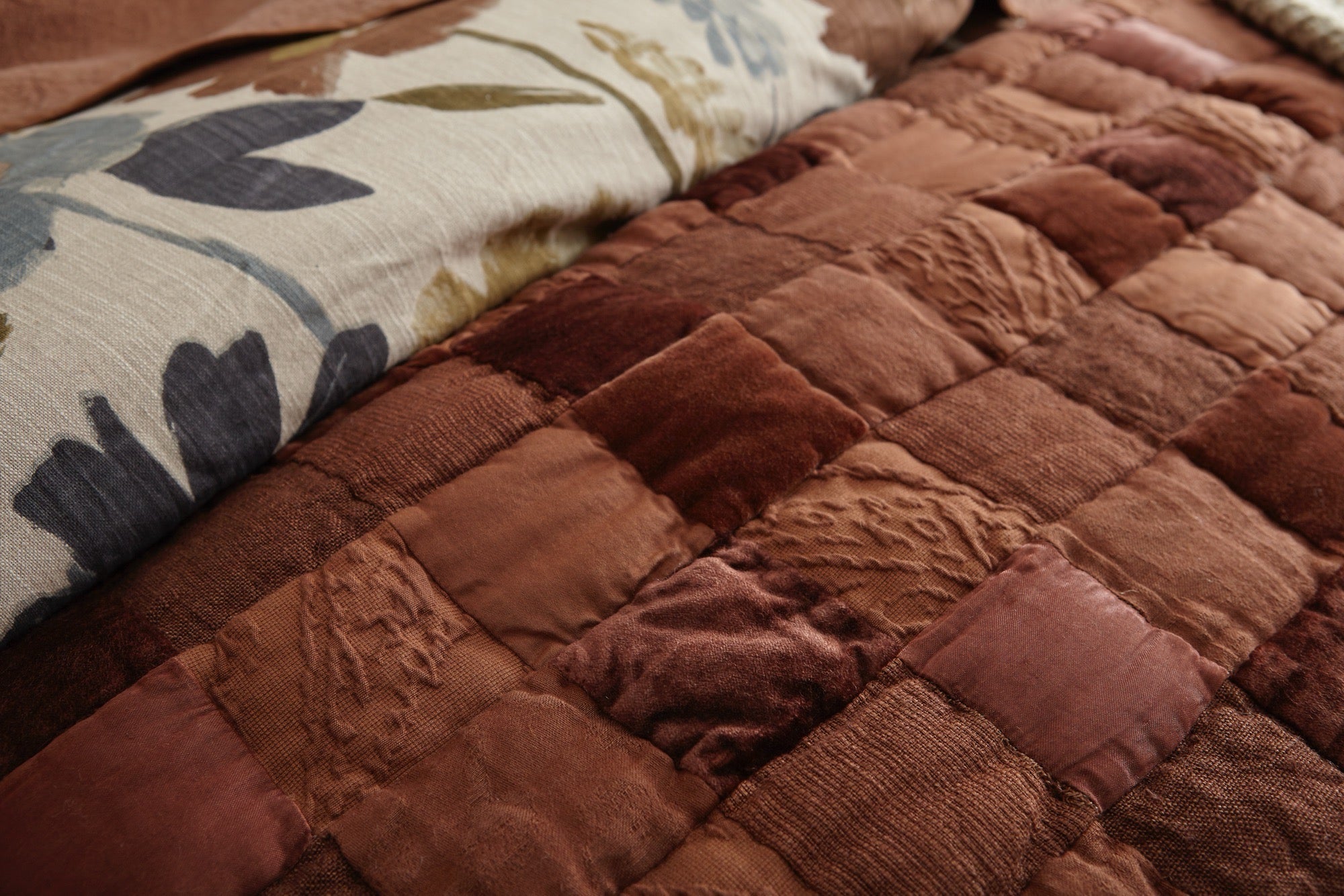 Description: The Kai quilt features an overdyed patchwork that combines a range of textures, including cotton velvet, linen, and rayon velvet. Inspired by handcrafted Moroccan tiles, this quilt showcases various materials and textiles. Once the exquisite fabrics are pieced together, they are over-dyed to create a harmonious yet dynamic tonal palette, resulting in a rich and vibrant finished product.