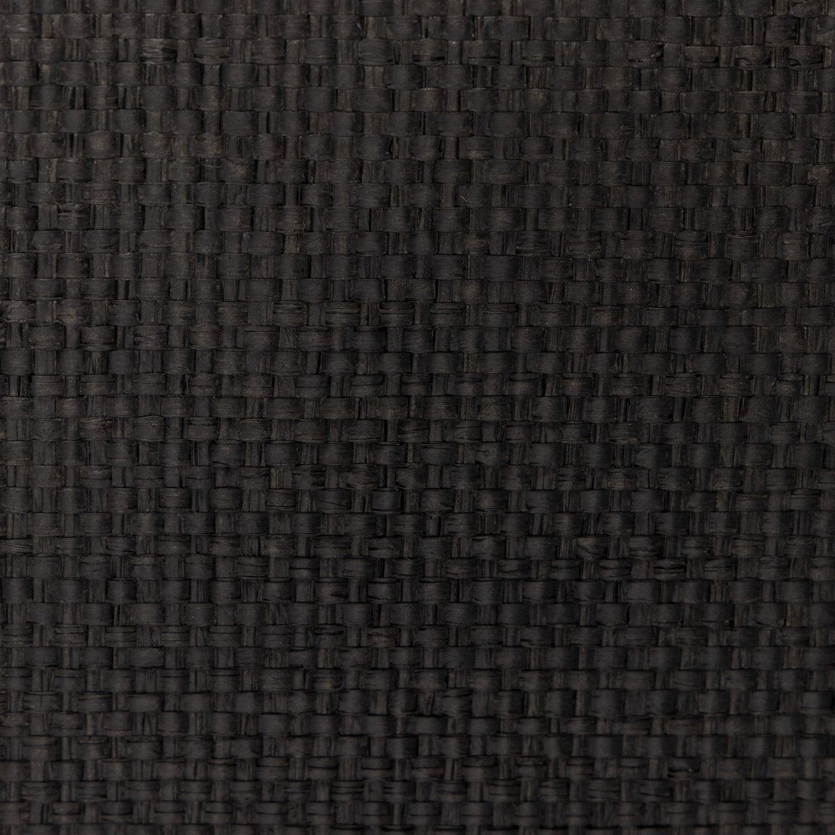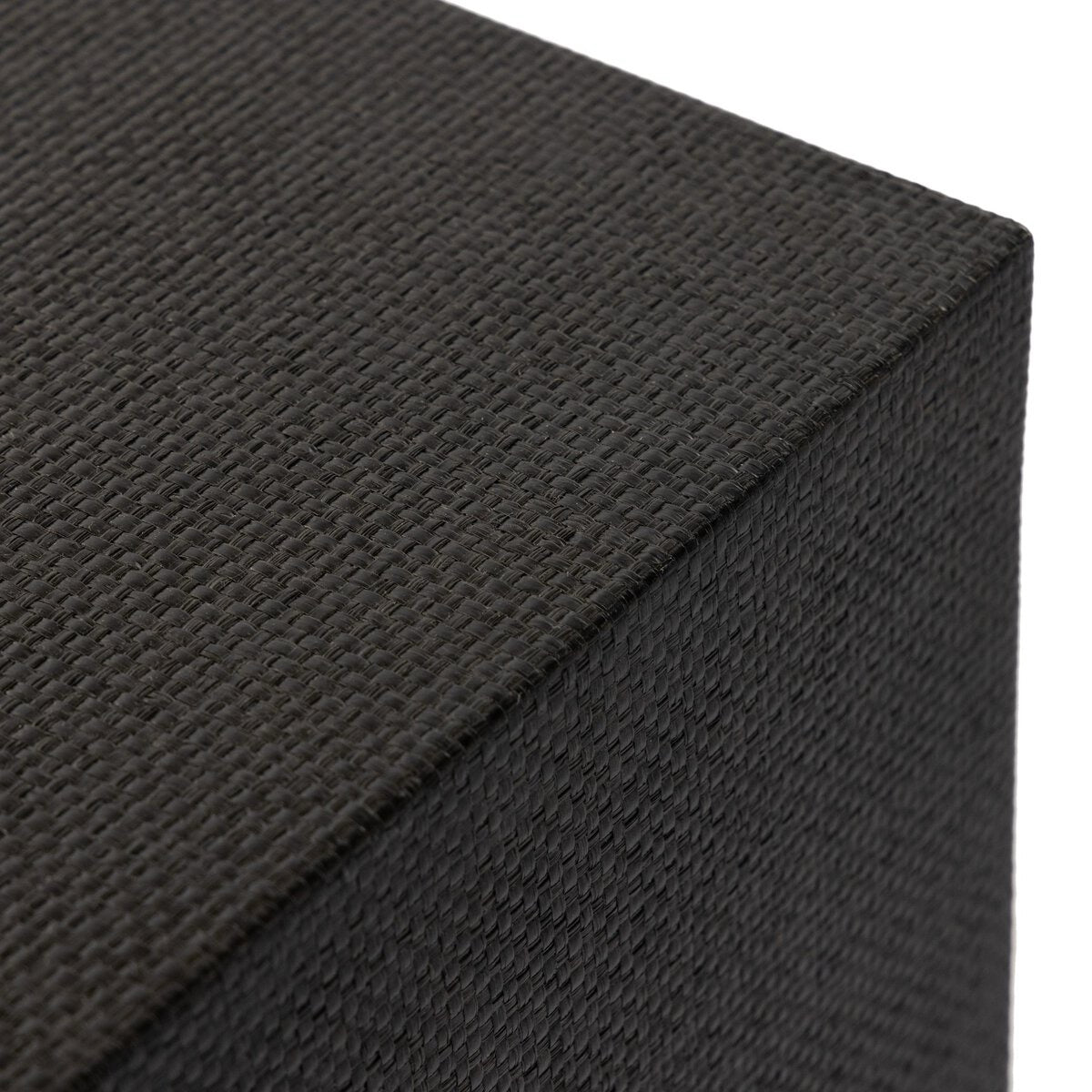 Description: Woven black raffia offers a texture-driven take on bedroom storage. Antique brass-finished iron hardware adorns six spacious drawers, all supported by a solid mahogany base.