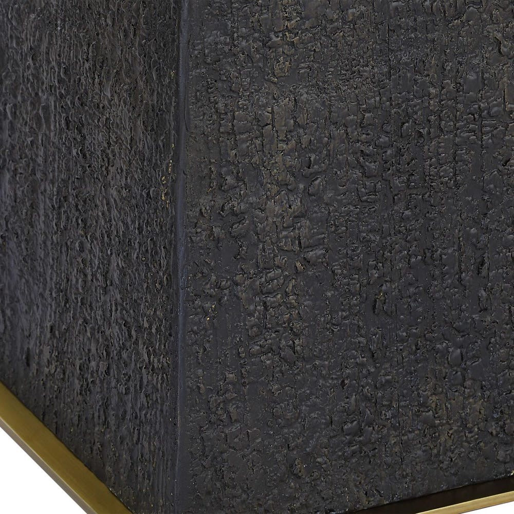 Description: The Lathey Floor Lamp showcases a tapered base with a burned wood look replicating the timeless Shou Sugi Ban technique of preserving wood, accented with plated brass details. The round hardback drum shade is a casual white linen fabric.