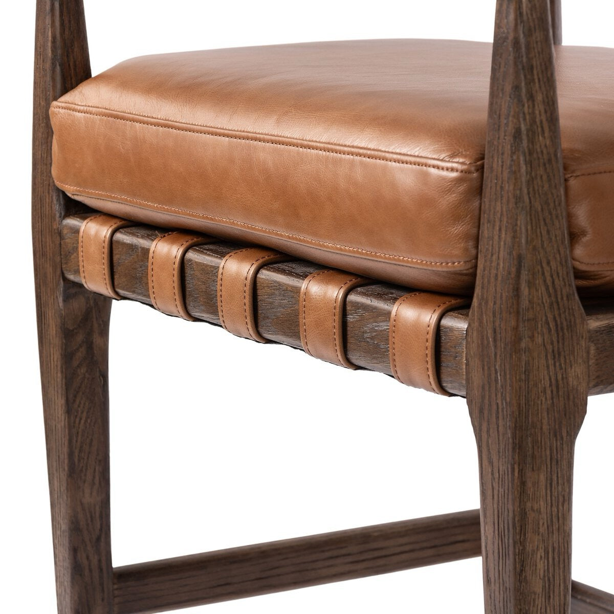 Description: Traditional safari styling is brought to modern speed. A solid wood frame features a webbed seating structure that brings a supported, sink-in feel to the entire piece. The upholstered back, strap details and loose cushion are finished in an olive flax/linen-blend fabric. Perfectly sized for the counter.