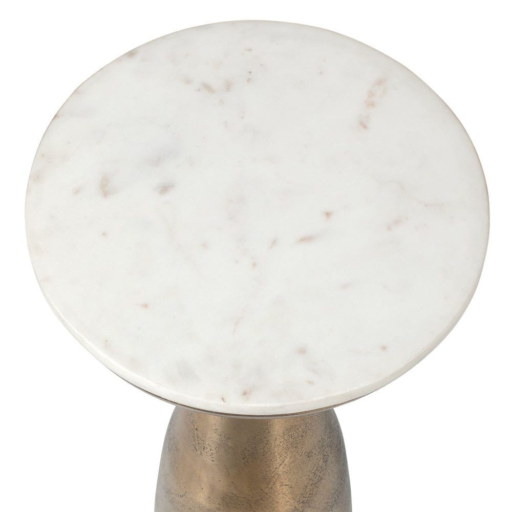 Description: Elevate your living space with the Torin drink table, a study in sophisticated simplicity. Its sleek silhouette begins with a gracefully tapered base, expertly cast from aluminum and finished in antique brass, topped with a white marble slab with natural toned veining. True to the nature of natural materials, each piece will have unique marbling and veining throughout.