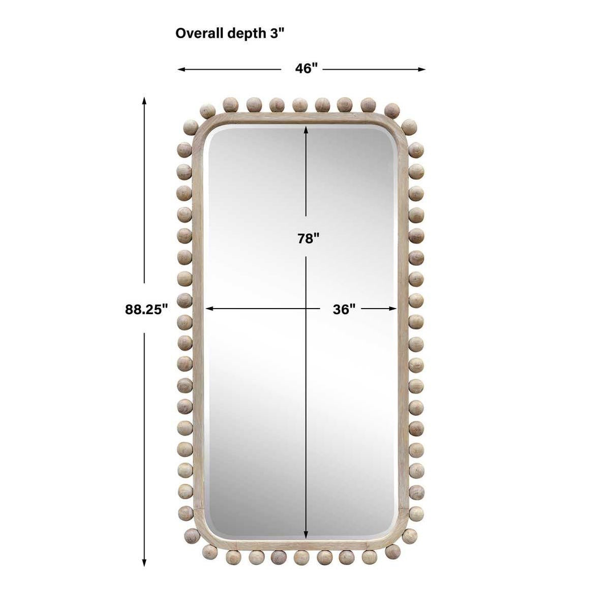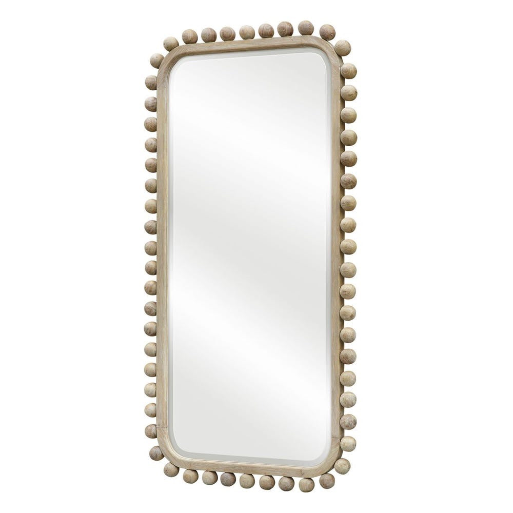 Description: Hand-brushed, solid wood spheres line the outer edge of a wooden frame, all in a natural finish. Mirror features a generous 1 1/2" bevel. May be hung horizontal or vertical.